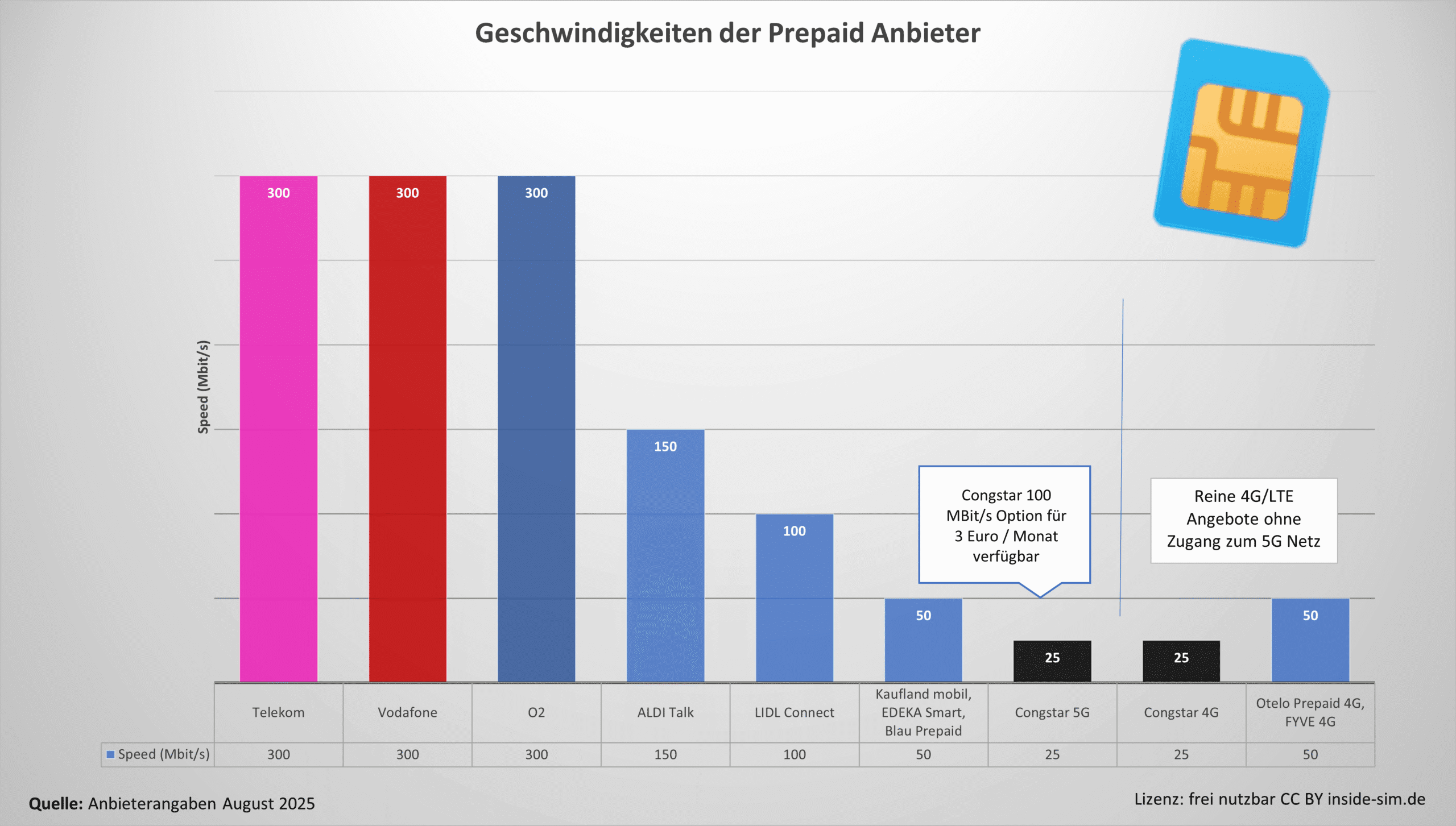 Congstar bietet seit Anfang 2024 auch im Prepaid-Bereich Zugang zum 5G-Netz – ein Schritt, der insbesondere für Nutzerinnen und Nutzer interessant ist, die Wert auf gute Netzabdeckung und moderne Standards legen, aber keinen Vertrag abschließen möchten. Die Geschwindigkeit ist jedoch bewusst limitiert, sodass die Vorteile von 5G nur teilweise ausgeschöpft werden können. Wer mehr Speed im D-Netz möchte, sollte sich diese Angebieter anschauen: die MagentaMobil Prepaid Sim der Telekom und die Vodafone Callya Sim